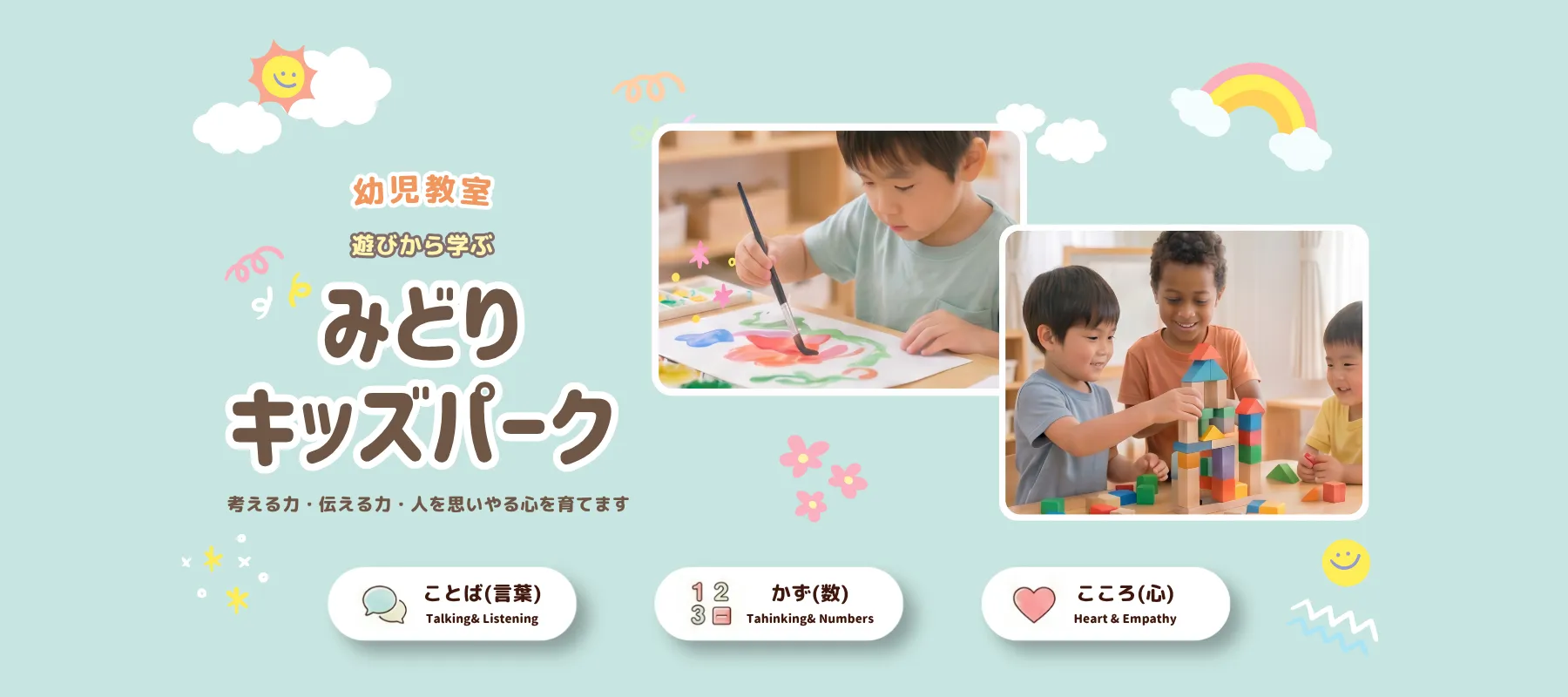遊びや体験を通して、ことば・かず・ここをを育てる幼児教室です。